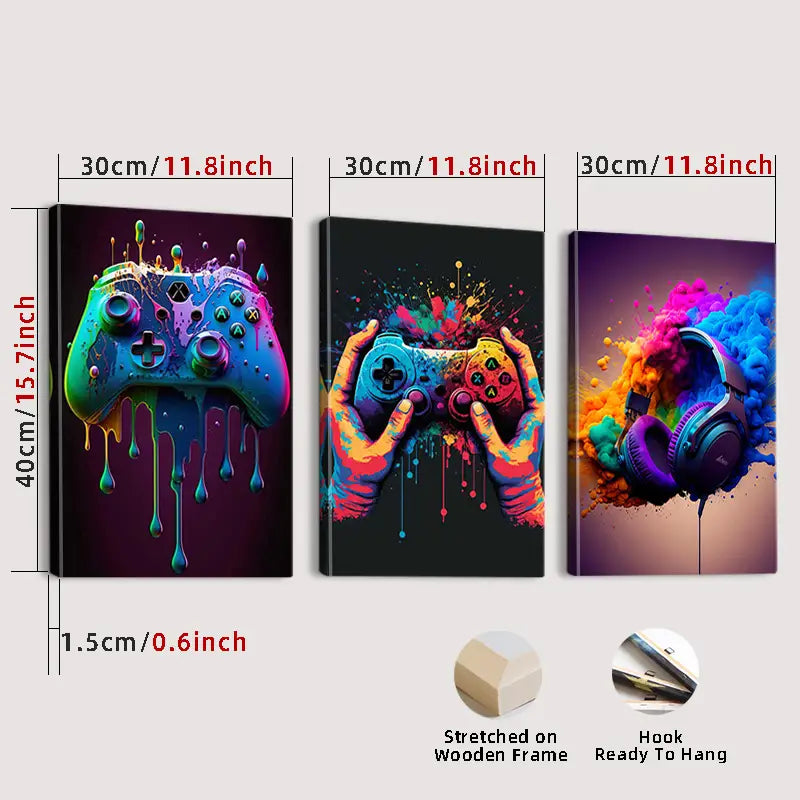 - Ce tableau plat 2D encadré se compose de trois pièces élégamment montées dans un cadre en bois, offrant une décoration moderne et raffinée inspirée des consoles de jeu vidéo.